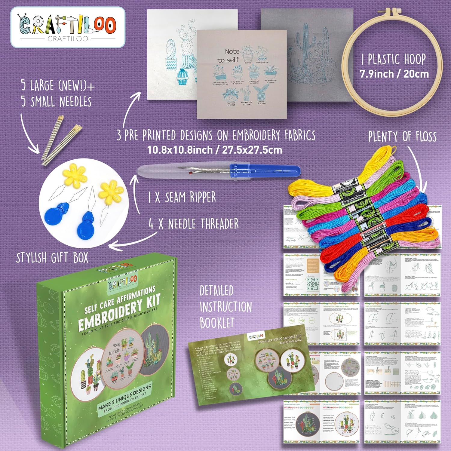 [EVERYTHING IS INCLUDED] Embroidery kit for beginners includes: 3 Designs Pre-Printed patterns on Embroidery Fabrics, 1 HQ Plastic Hoop 7.9", Plenty of Floss, 10 Embroidery needles ,2 needle threader ,1 Seam ripper, Detailed Instruction Booklet