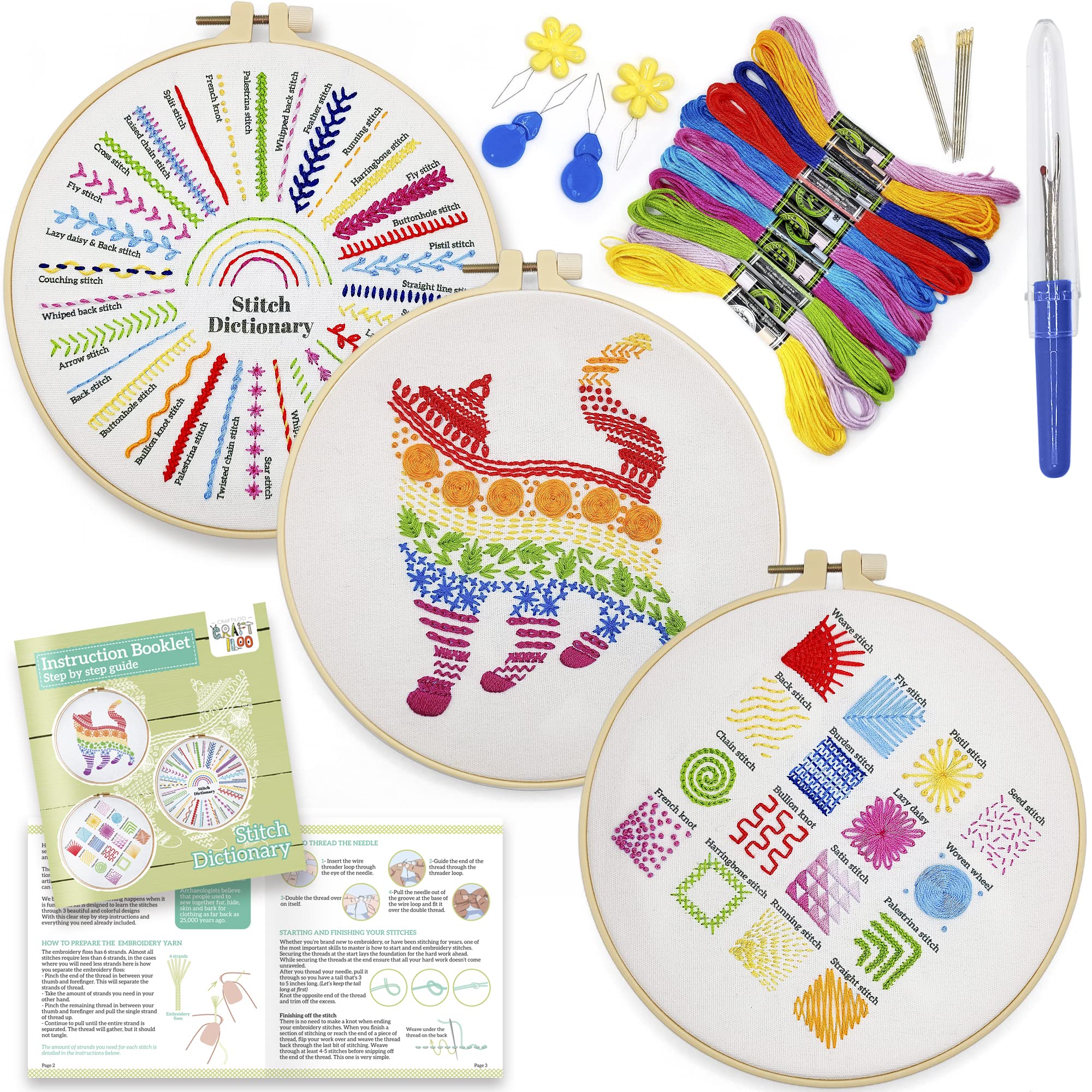 [EVERYTHING IS INCLUDED] Embroidery kit for beginners includes: 3 Designs Pre-Printed patterns on Embroidery Fabrics, 1 HQ Plastic Hoop 7.9", Plenty of Floss, 10 Embroidery needles ,2 needle threader ,1 Seam ripper, Detailed Instruction Booklet