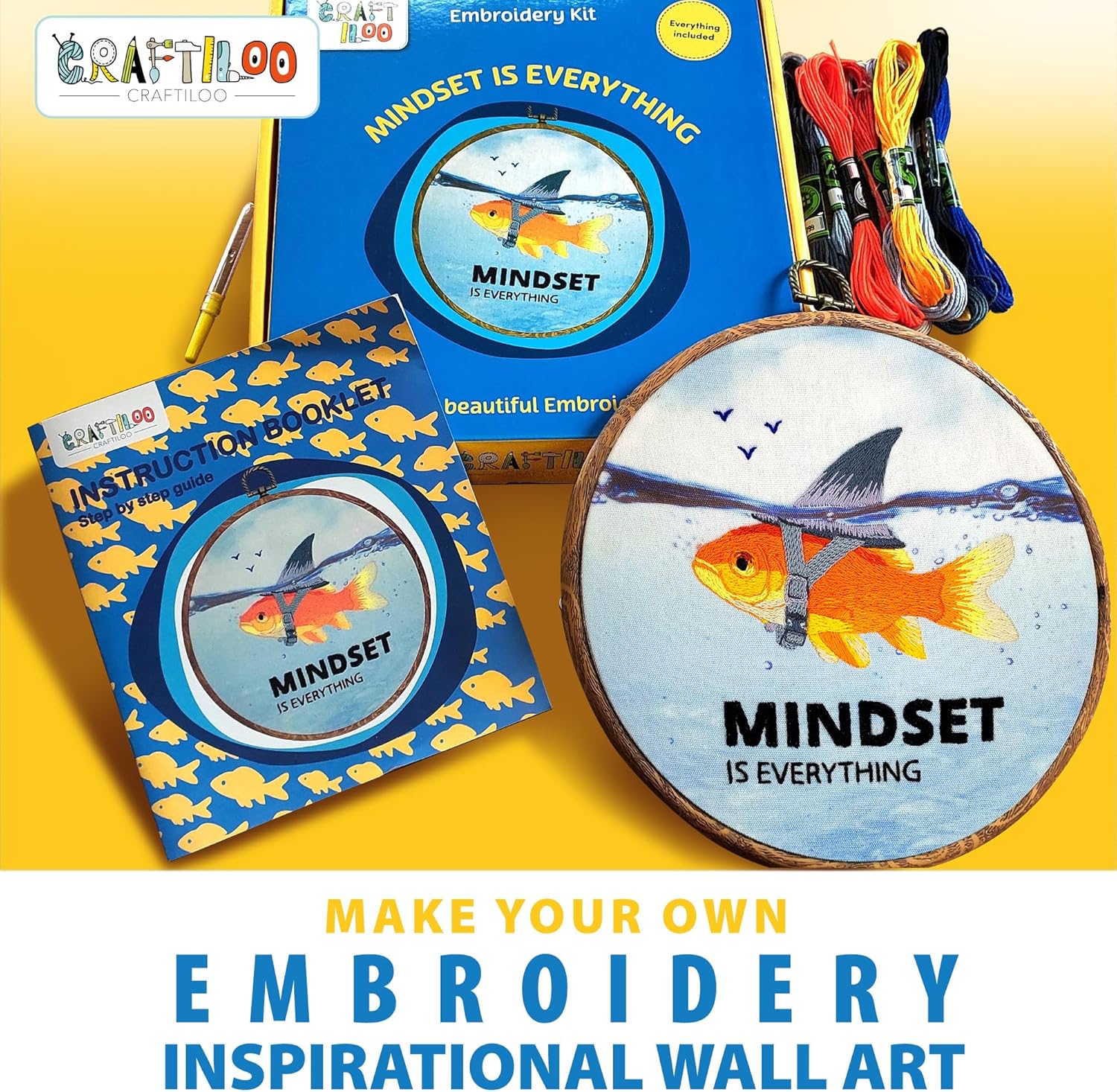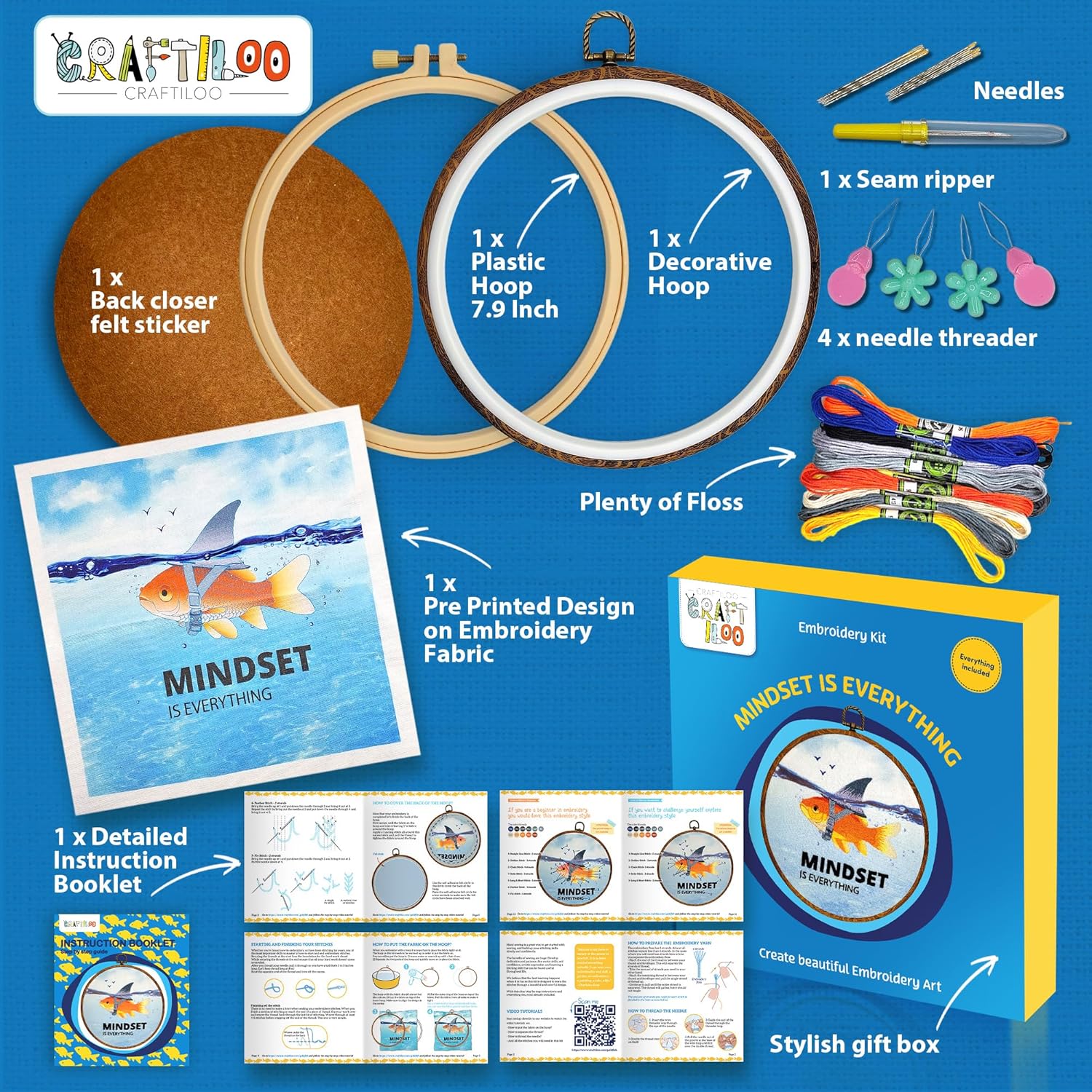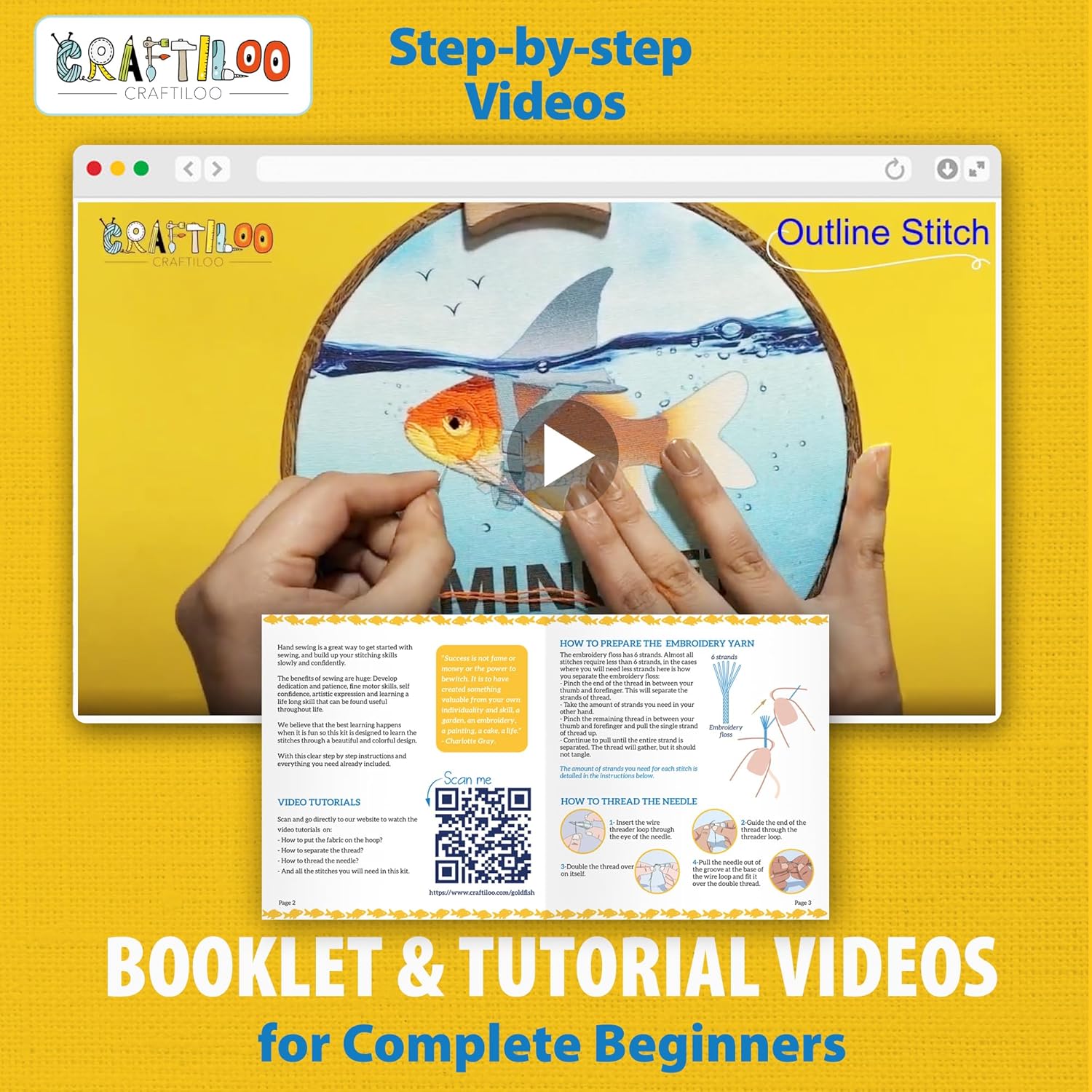 BEST VALUE EMBROIDERY KIT FOR BEGINNERS] This arts and crafts for adults kit includes a fully colored picture pre printed on the fabric with a beautiful goldfish inspirational embroidery pattern & a step-by-step booklet guide in English .