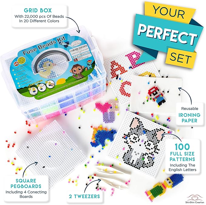 - ENDLESS HOURS OF FUN:With this incredible arts and crafts toy melty beads for kids your kid will have endless hours of fun playing with you. The 22,000 colorful beads will help your little one spend time in a creative way and develop its artistic expression and coordination.