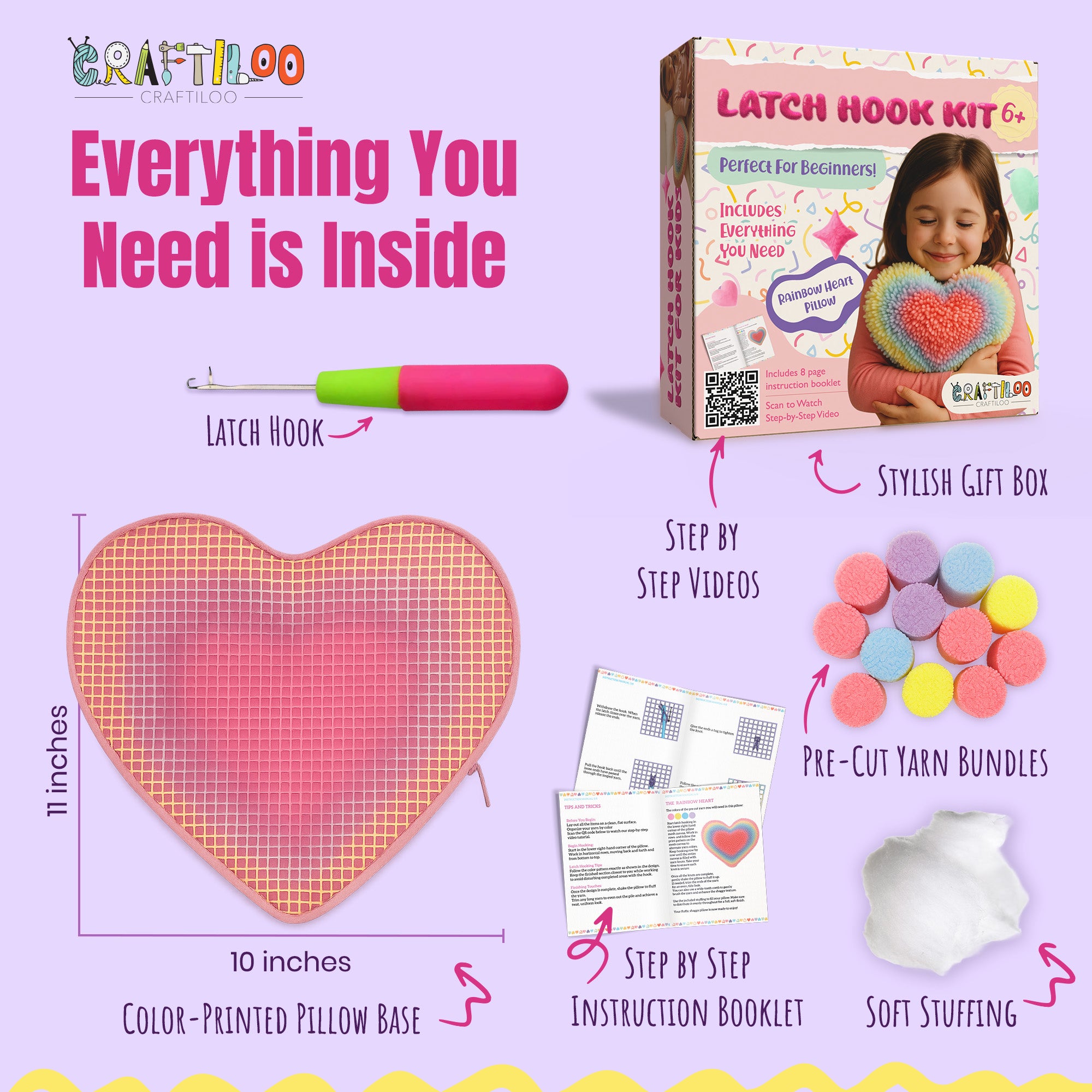 - All in One Kit - Open and Start Crafting Everything You Need is inside: pillow base with color grid, precut yarn, latch hook tools, soft stuffing, plastic eyes, and an instruction booklet. This latch hook kit is designed to reduce prep time and maximize fun from the very first loop.