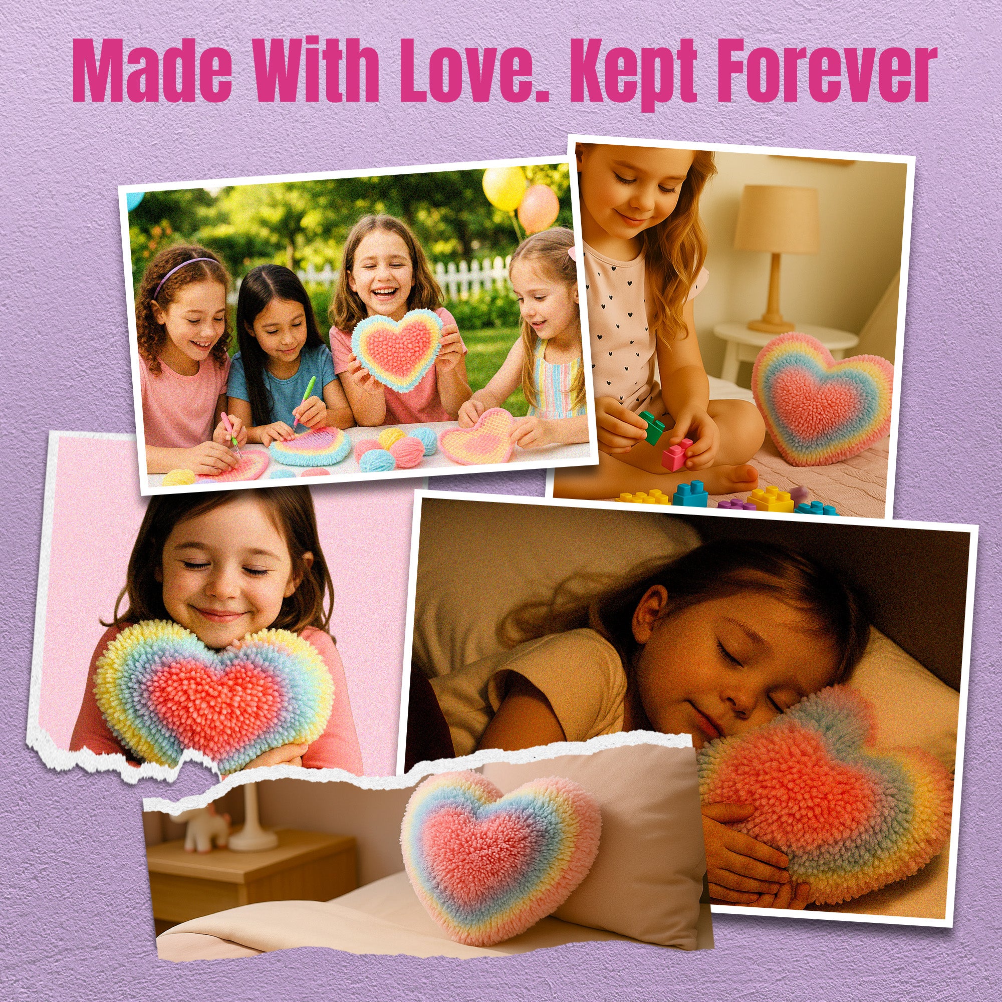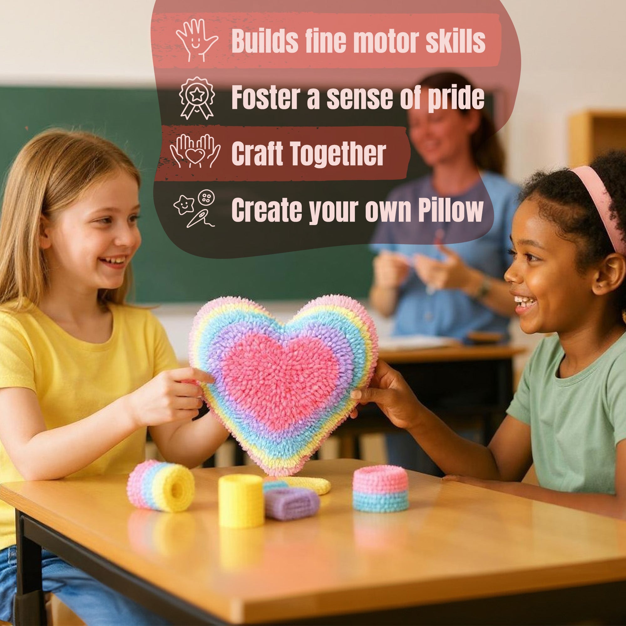 - Whimsical Designs Kids Love to Show Off Whether it's a rainbow heart, a googly-eyed heart, or a wise little owl-these playful latch hook kits for kids turn into pillows they'll be proud to display in their room or share with friends.