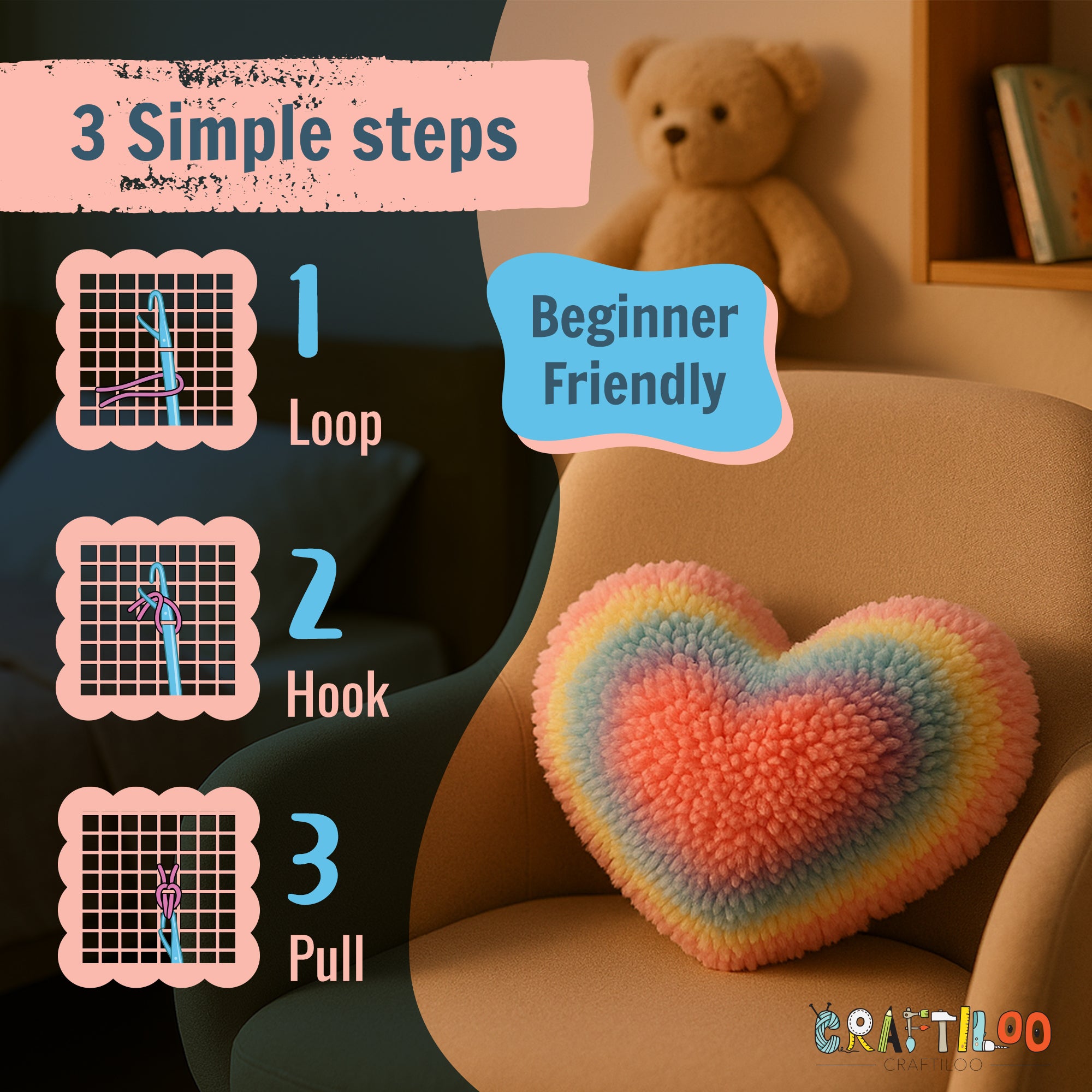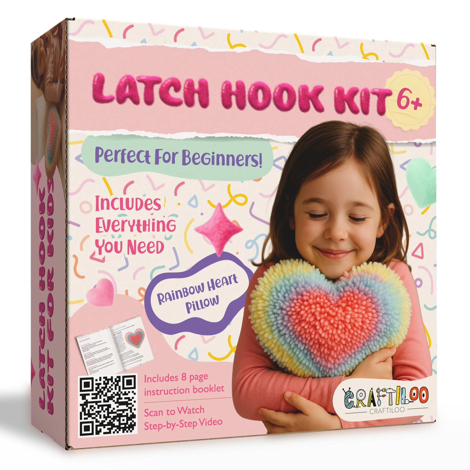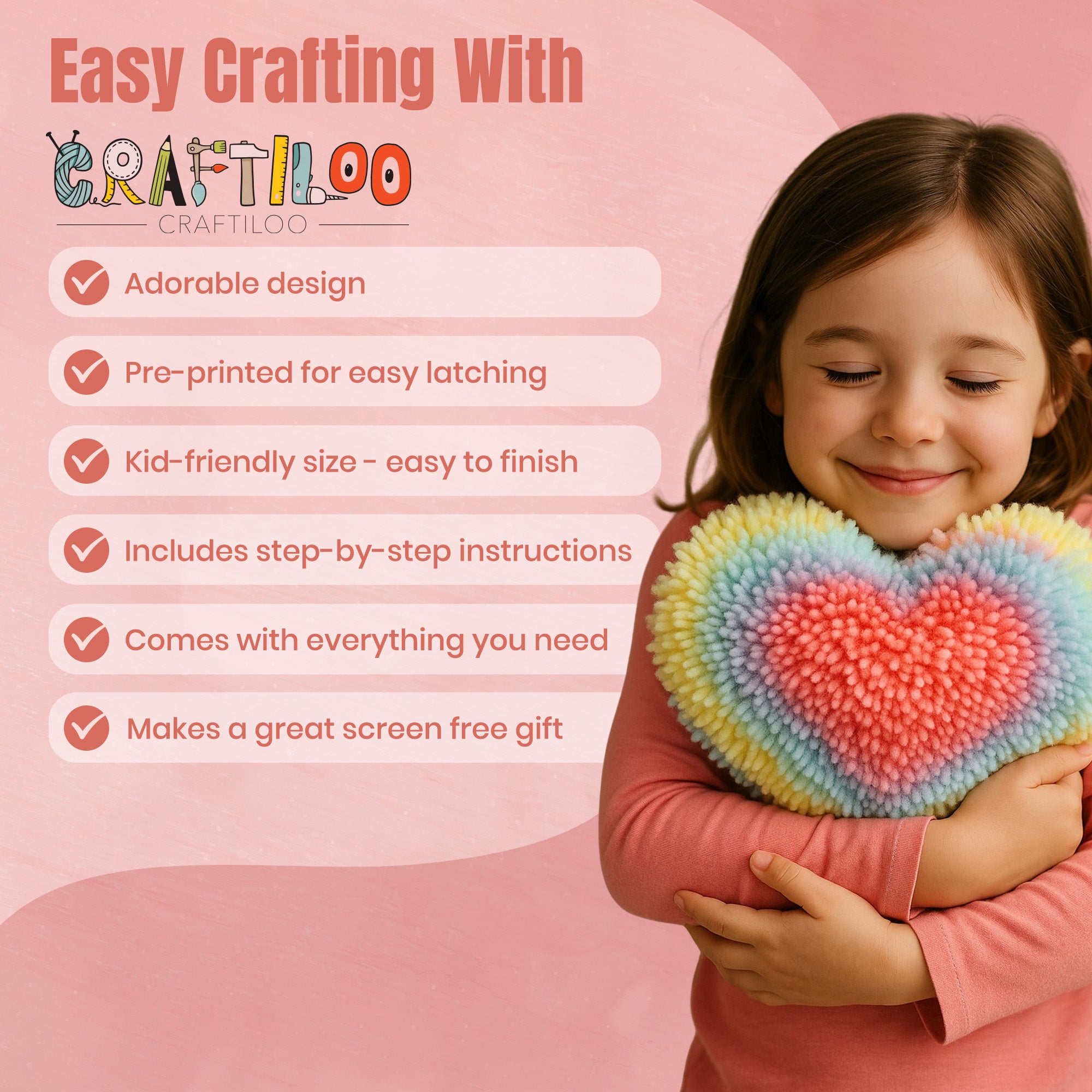 CRAFTILOO Latch Hook Kit for Kids Rug DIY Pillow Craft with Hook, Precut Yarn, Easy to Follow Pattern Cute Designs with Rainbow Heart Ages 8+