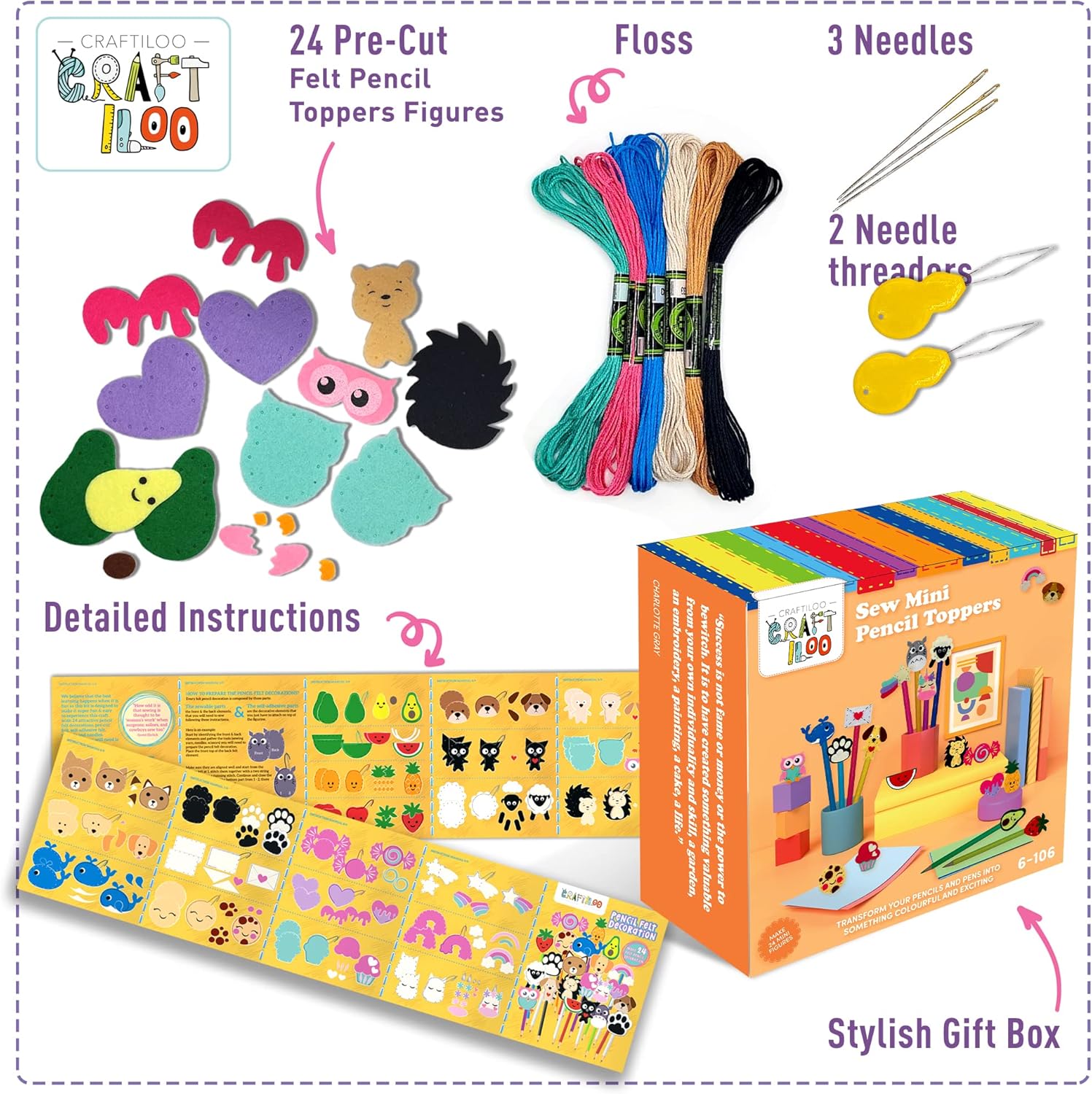 PACKAGE & SIZE -: Featuring everything you need in these adorable pencil toppers to sew kit, this beginner sewing kit includes 24 precut patterns in felt fabric, embroidery floss, and needles including decorative supplies for a hand sewing project