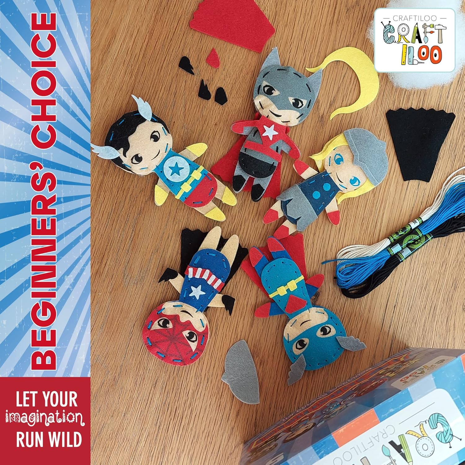 QUALITY FABRICS AND FLOSS: Featuring everything you need to start crafting these adorable plush figures, this beginner sewing kit includes precut felt for 5 Superheros figures , Felt decorations ,needles, embroidery floss, stuffing, clear glue, and an easy to follow illustrated guide.