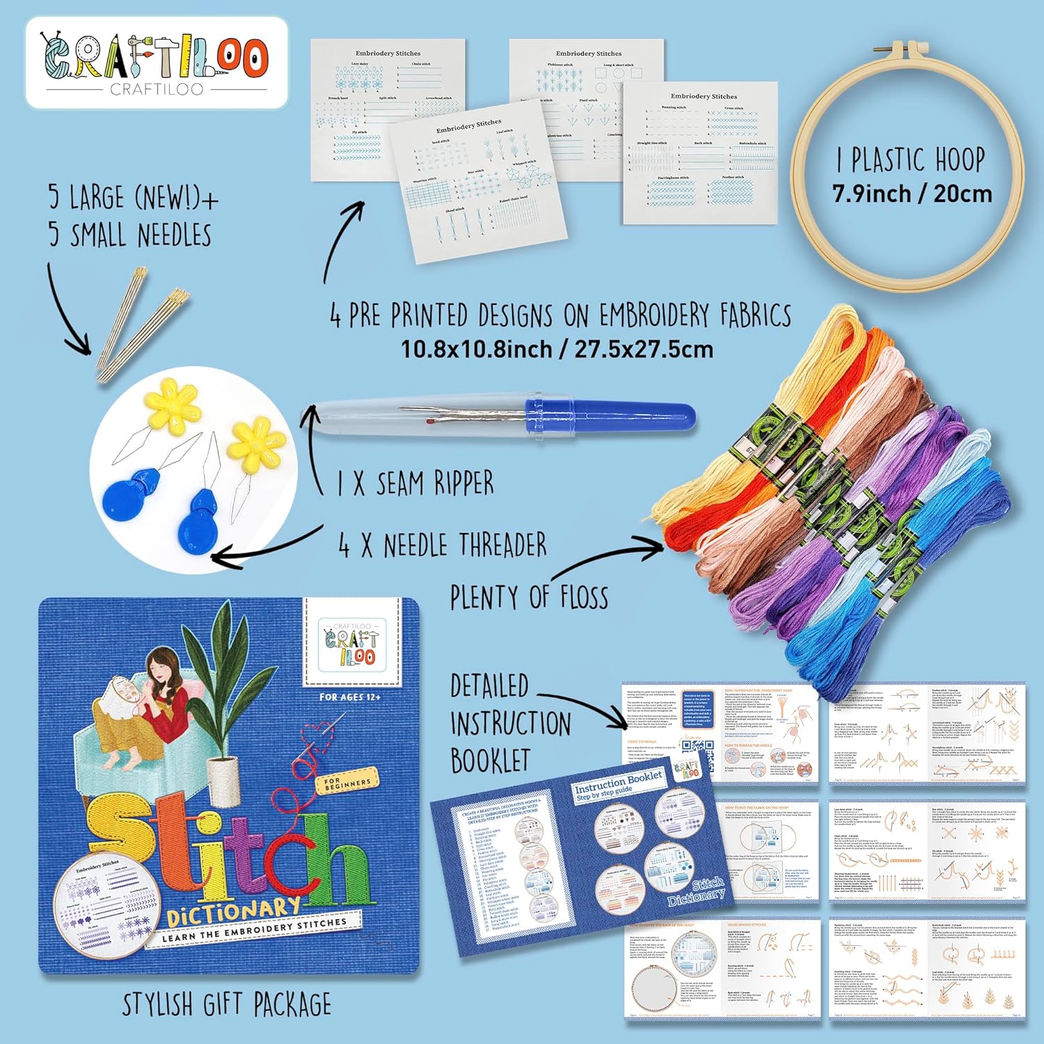 [EVERYTHING IS INCLUDED] Embroidery kit for beginners includes: 3 Designs Pre-Printed patterns on Embroidery Fabrics, 1 HQ Plastic Hoop 7.9", Plenty of Floss, 10 Embroidery needles ,2 needle threader ,1 Seam ripper, Detailed Instruction Booklet