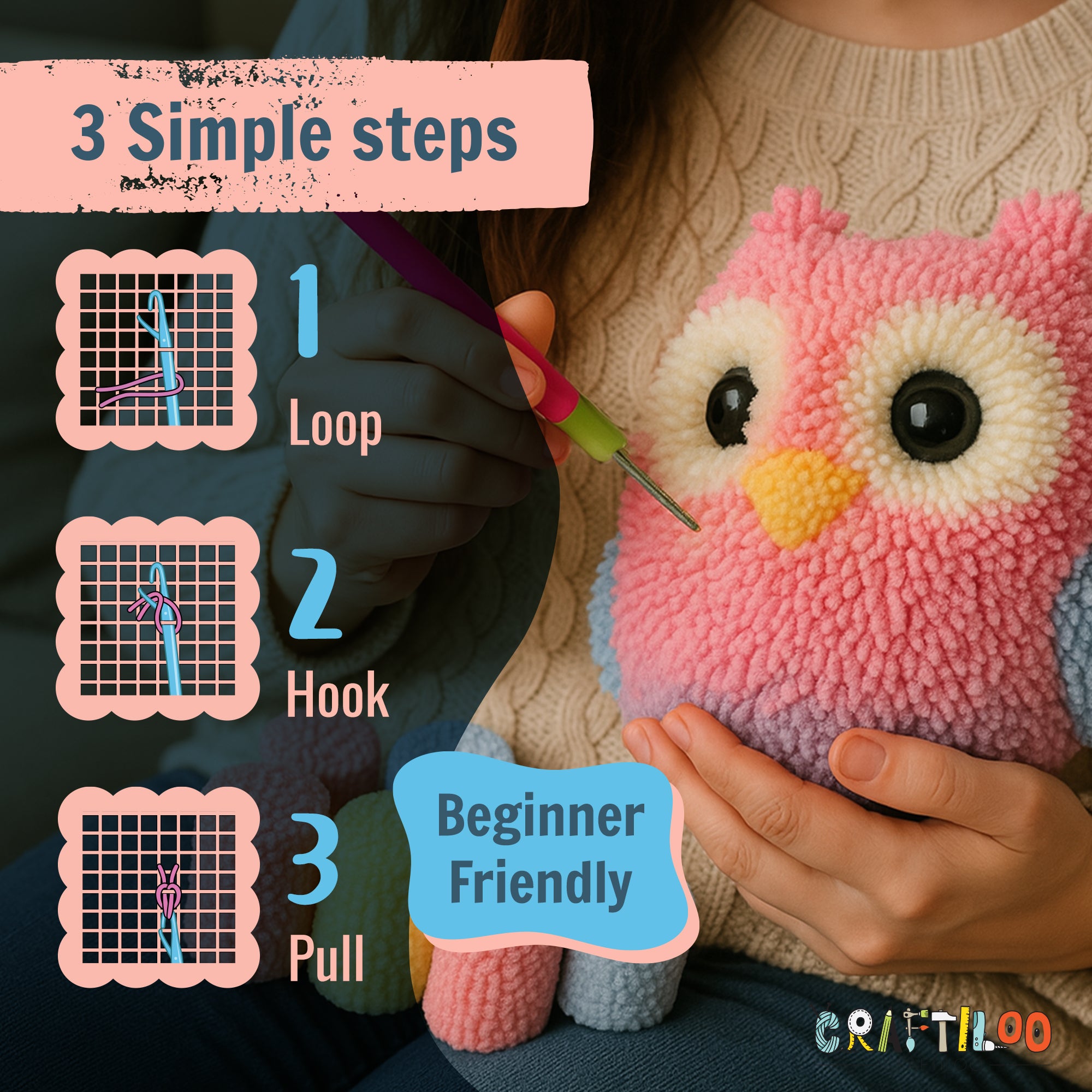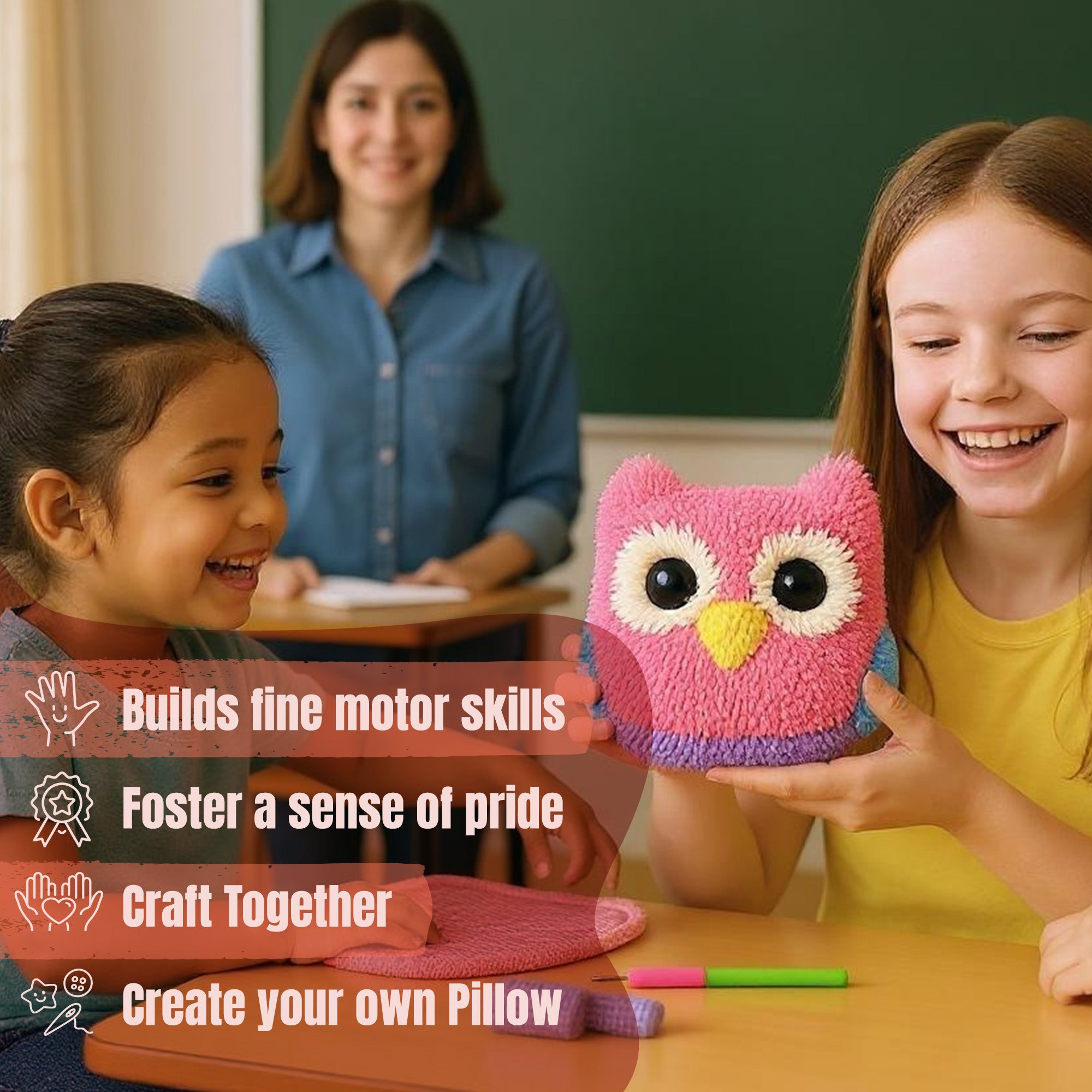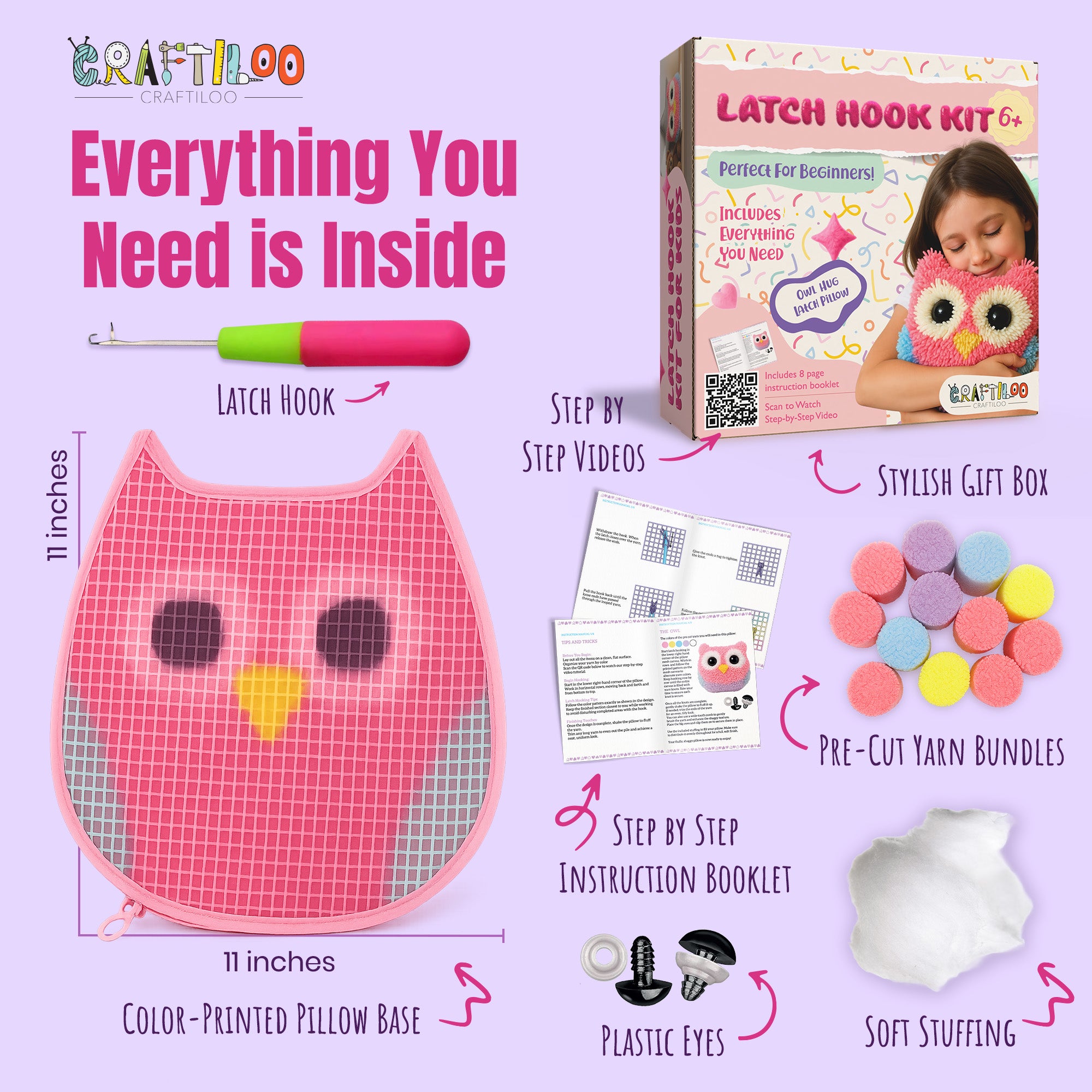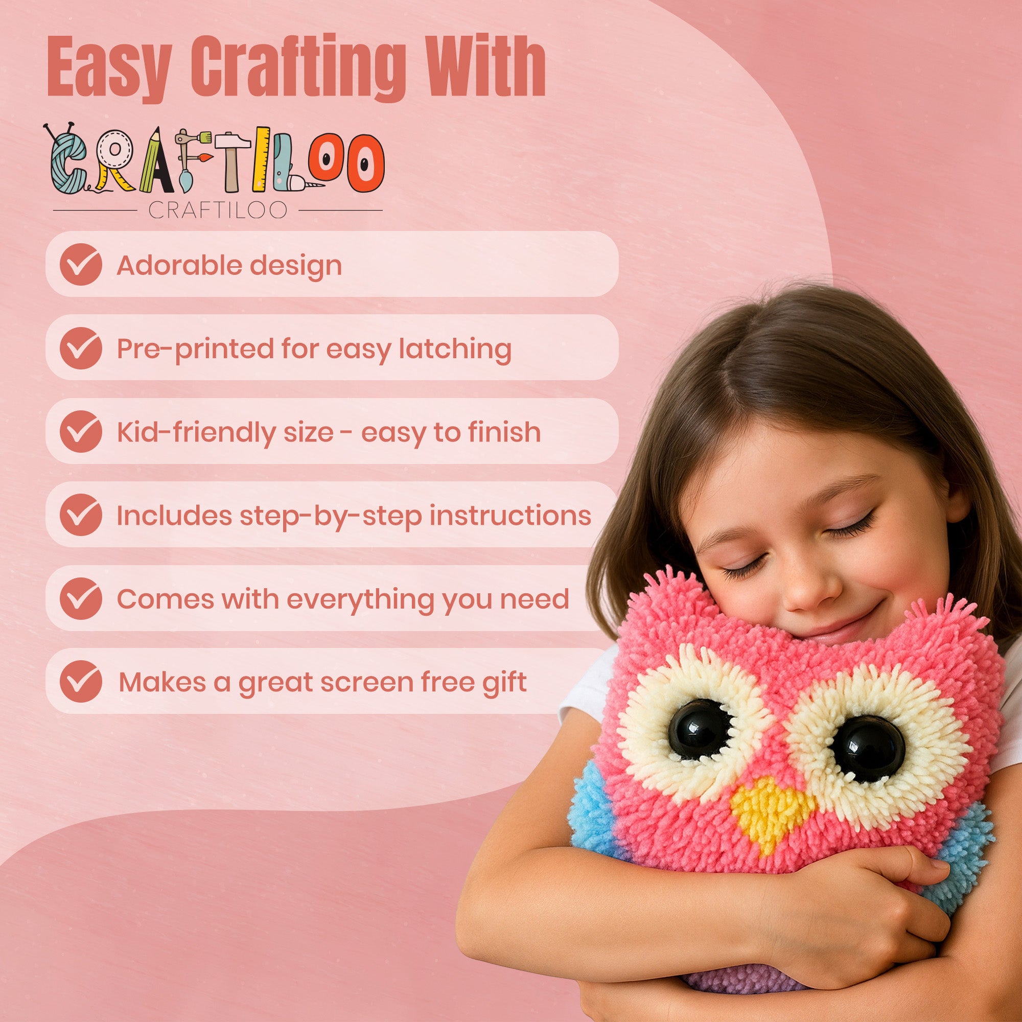 CRAFTILOO Latch Hook Kit for Kids Rug DIY Pillow Craft with Hook, Precut Yarn, Easy to Follow Pattern Cute Designs with Wise Owl Ages 8+